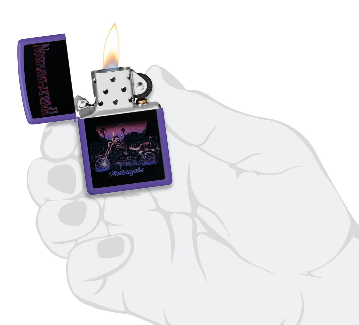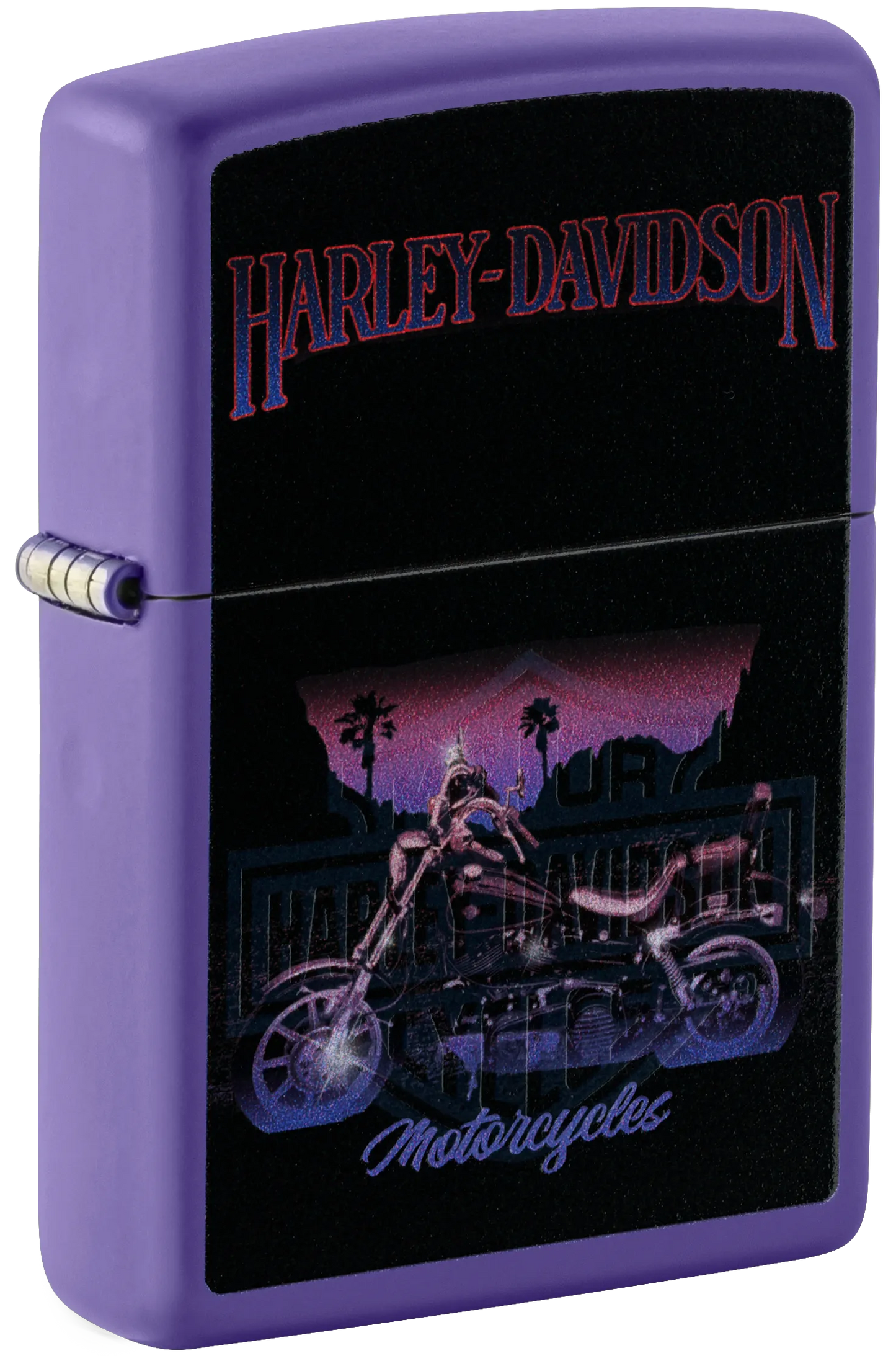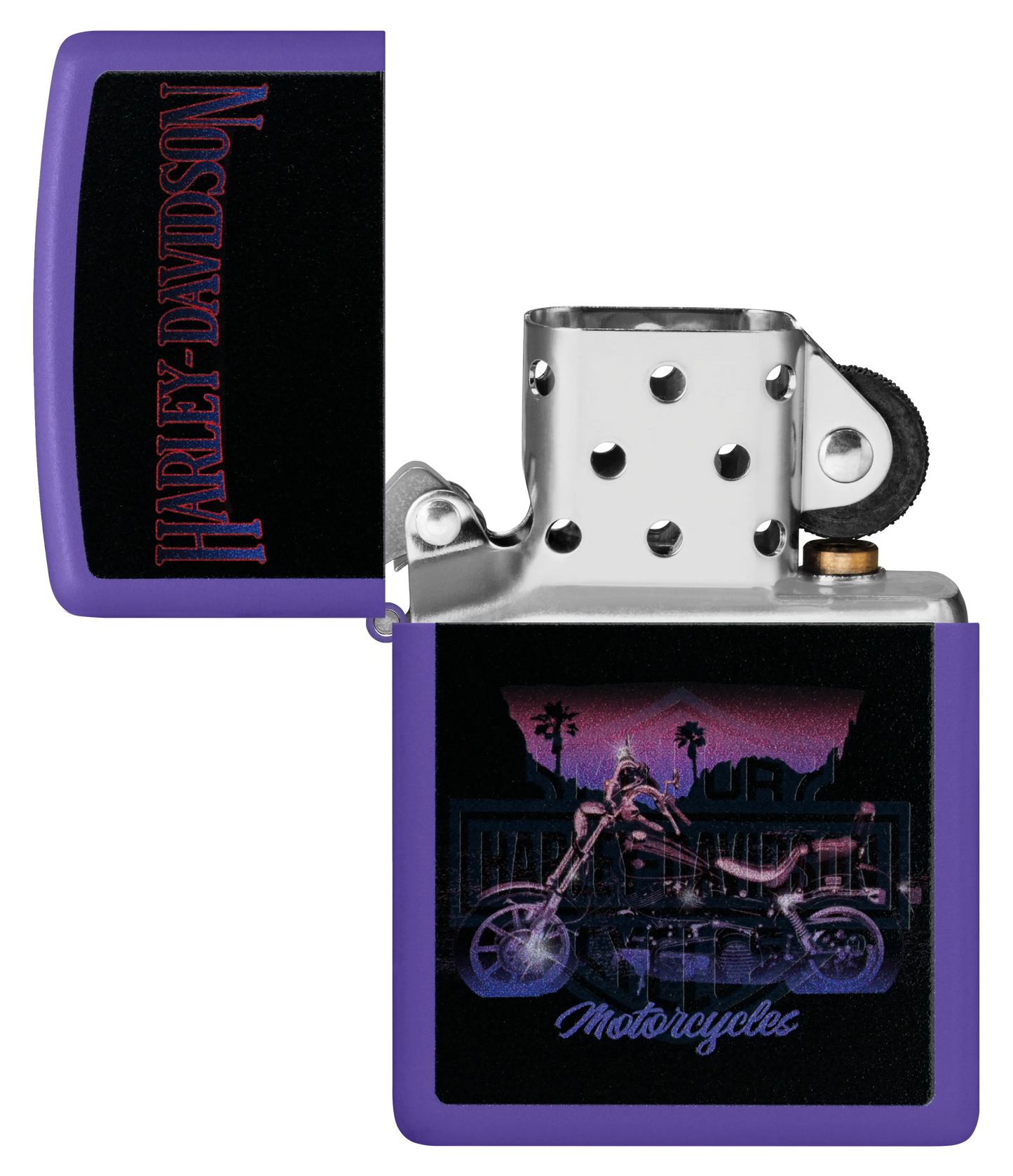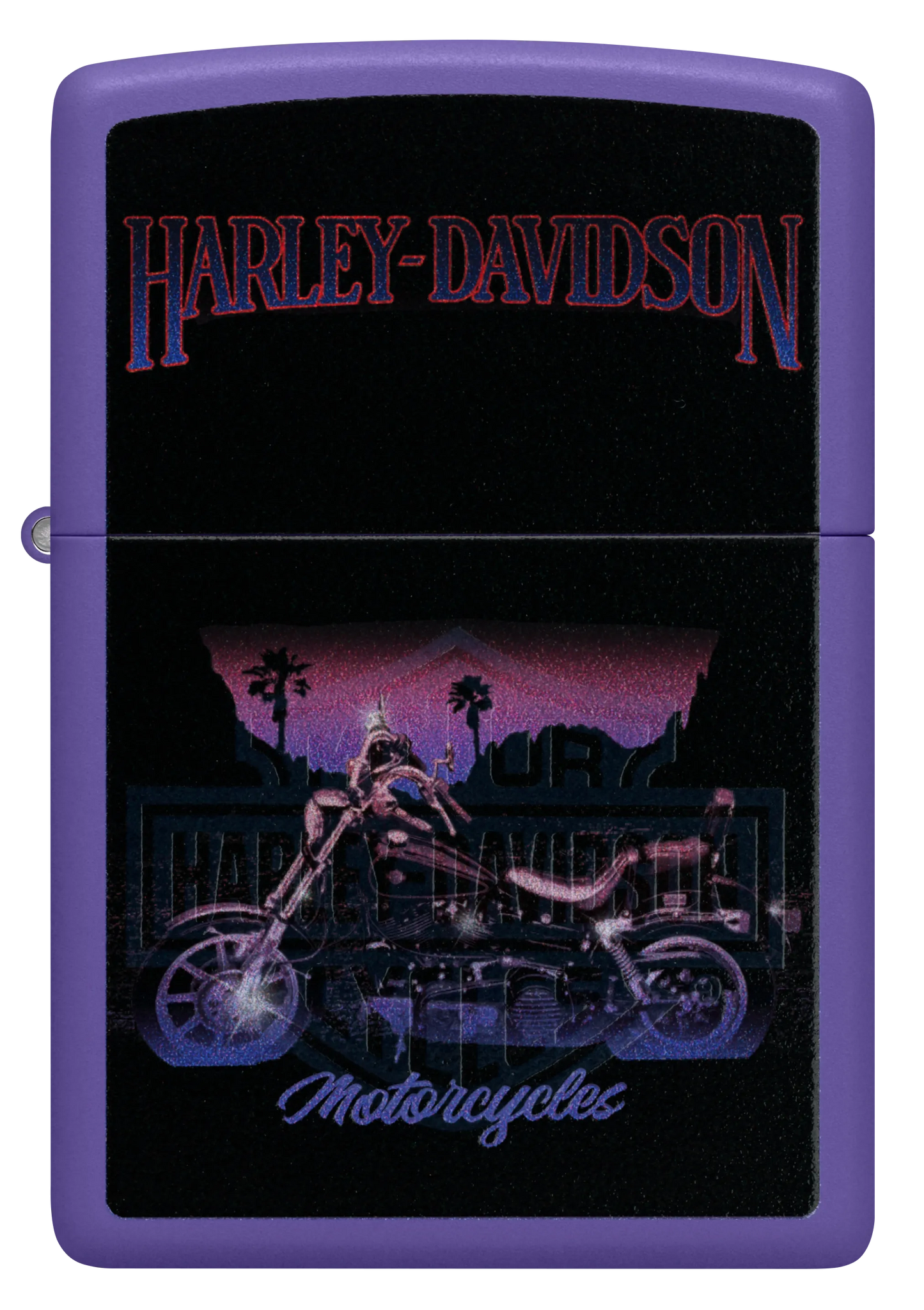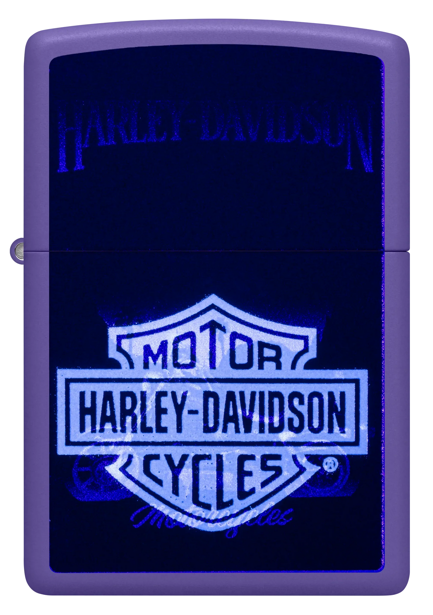 Ce briquet Purple Matte au look hallucinant représente une moto Harley-Davidson classique dans un motif Color Image mélancolique. Placez le briquet sous une lumière ultraviolette et faites apparaître l'emblématique logo du bouclier traversé d'une barre grâce à notre procédé Black Light .