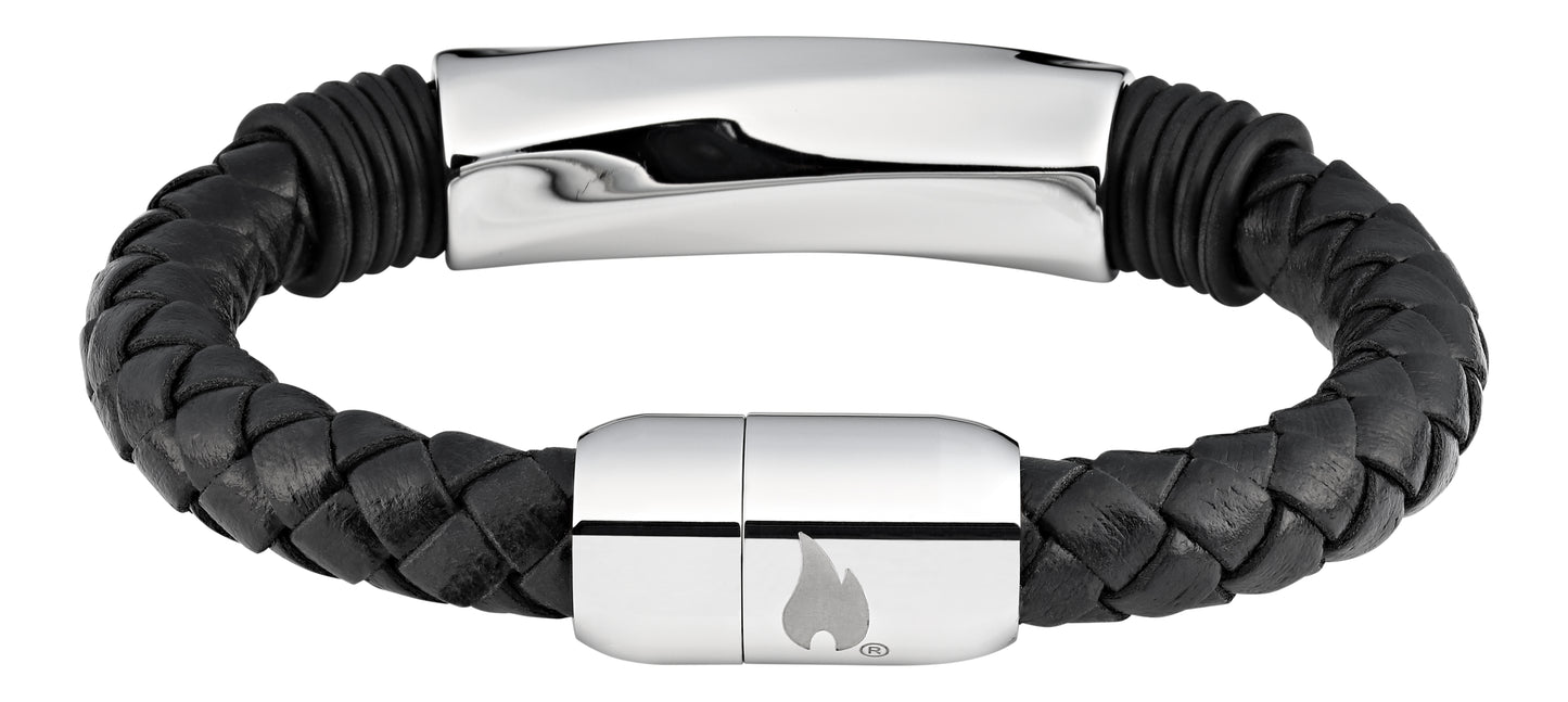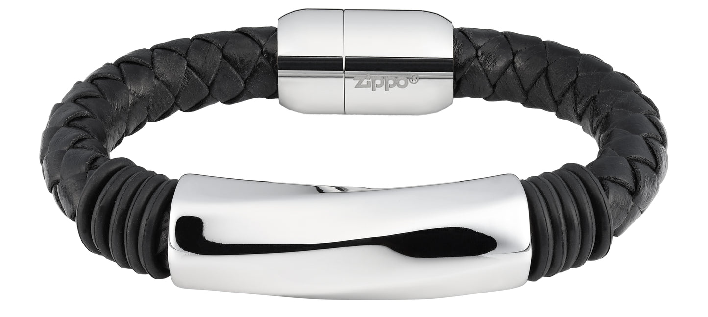 Bracelet en cuir véritable composé d'un seul bracelet individuel en cuir fin tressé, décoré par un boîtier en acier inoxydable. Le fermoir plat du bracelet est doté d'un aimant intégré. Il suffit de pousser chaque extrémité pour qu'elle se fixe au poignet. L'intérieur du fermoir est décoré du logo Zippo original et l'extérieur de la flamme Zippo.