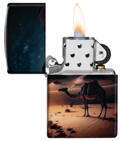 Un dromadaire se tient stoïquement au premier plan d'un paysage désertique et aride, tandis que son compagnon admire le cosmos dans un superbe motif 540° Color.