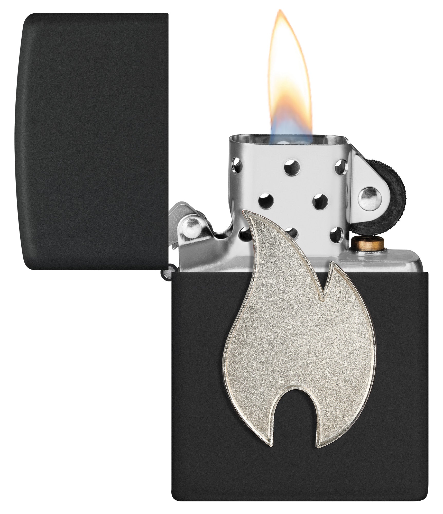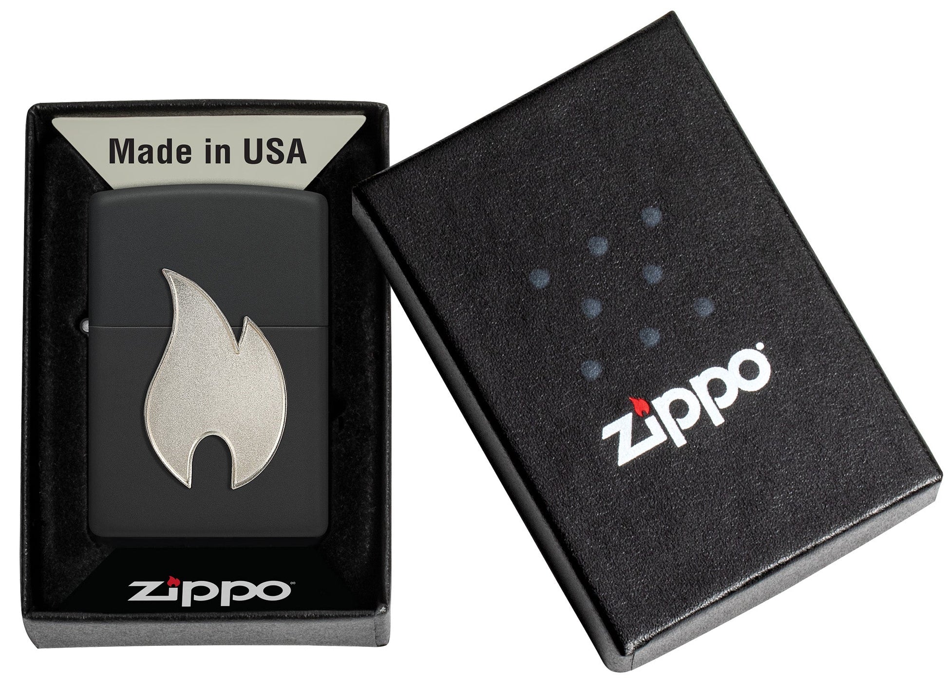 Ce briquet classique noir mat arbore l’icône de la flamme Zippo sous forme d’emblème métallique argenté, qui reste en place même lorsque vous ouvrez le briquet.