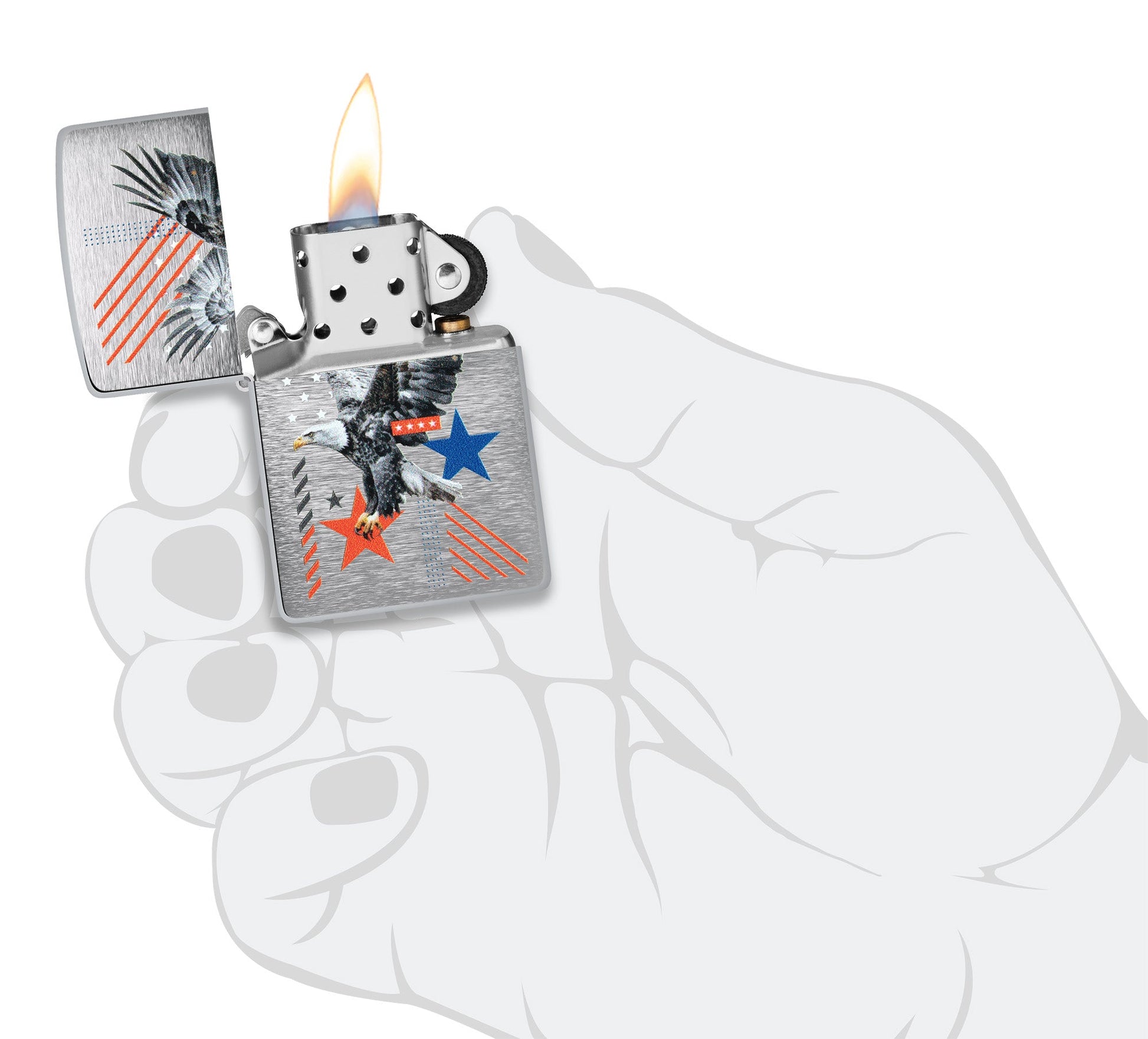 Soutenu par des motifs patriotiques rappelant les étoiles et les rayures du drapeau américain, un pygargue plane sur la surface de ce briquet Brushed Chrome classique dans un motif d’image colorée audacieux.