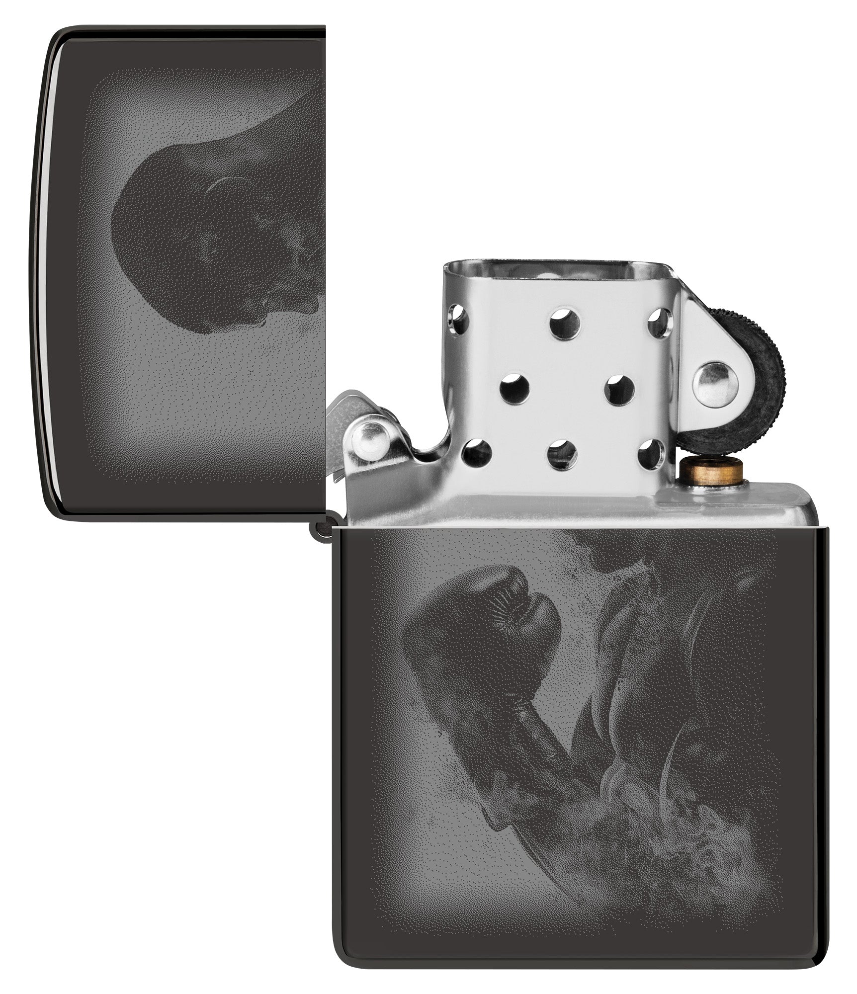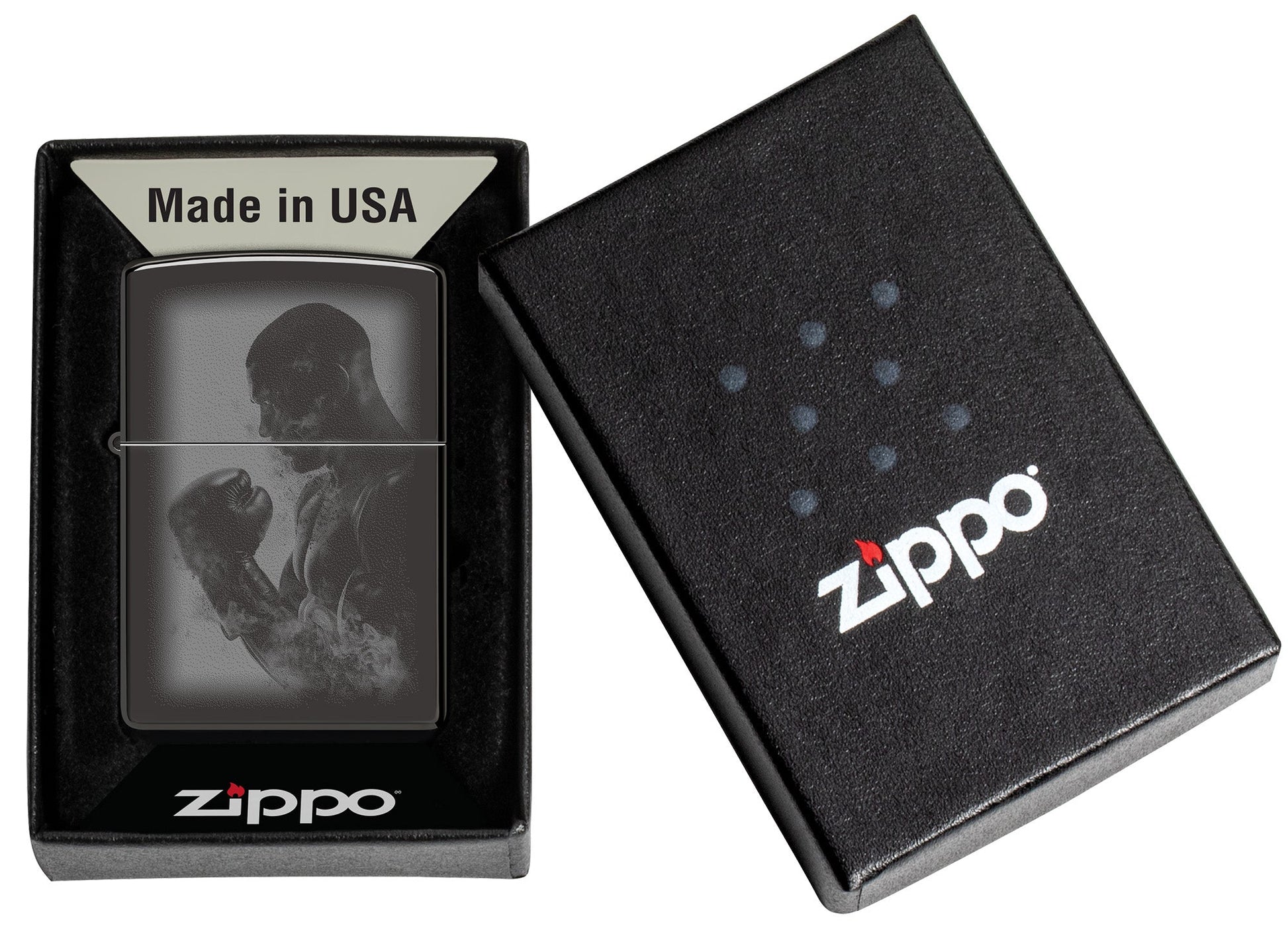 Le cœur d'un champion ne s'arrête jamais, tout comme ce briquet High Polish Black classique. Connu pour son dévouement, sa discipline et sa force mentale, un boxeur est représenté prêt pour le combat dans un motif Photo Image enfumé.