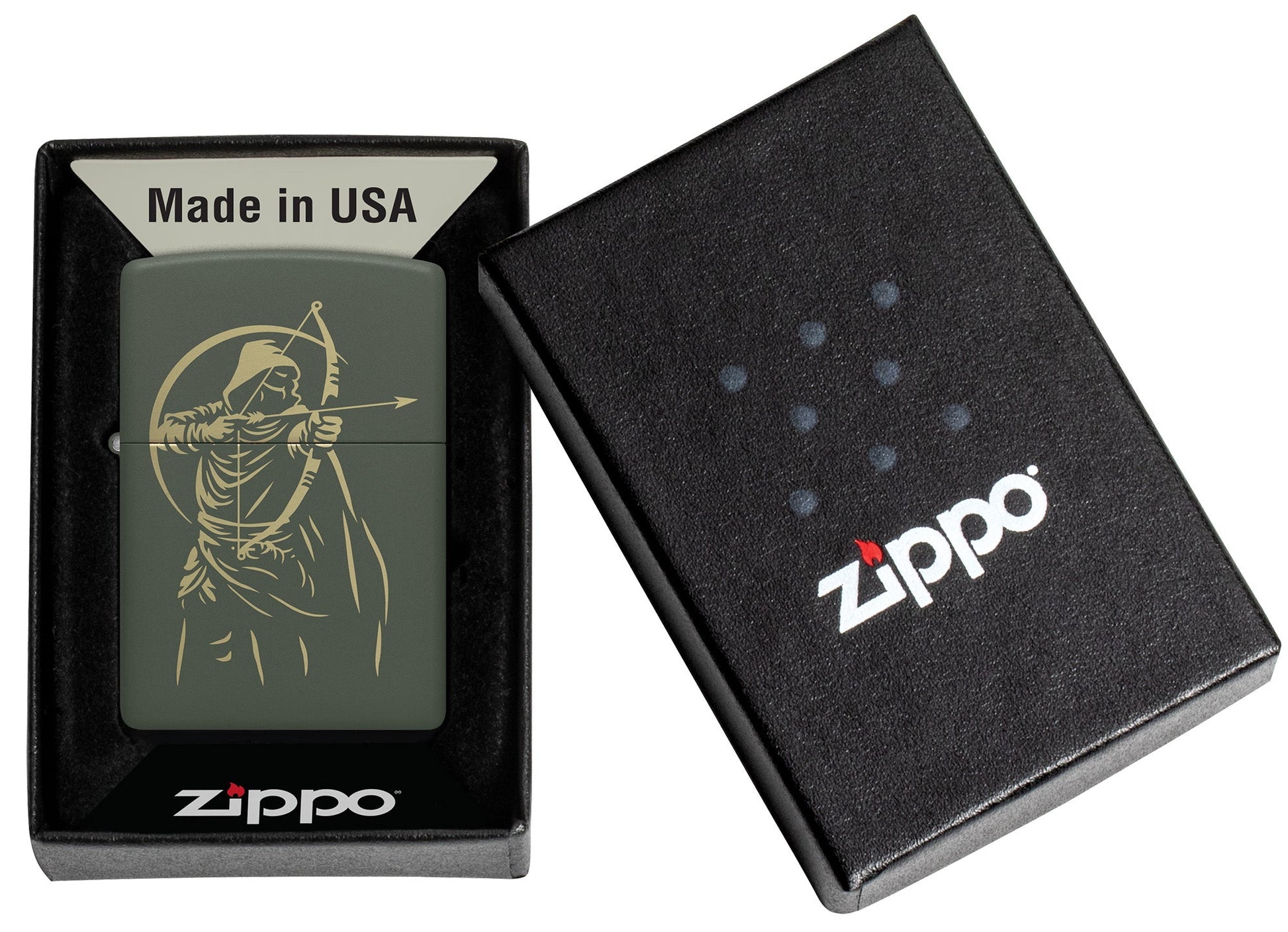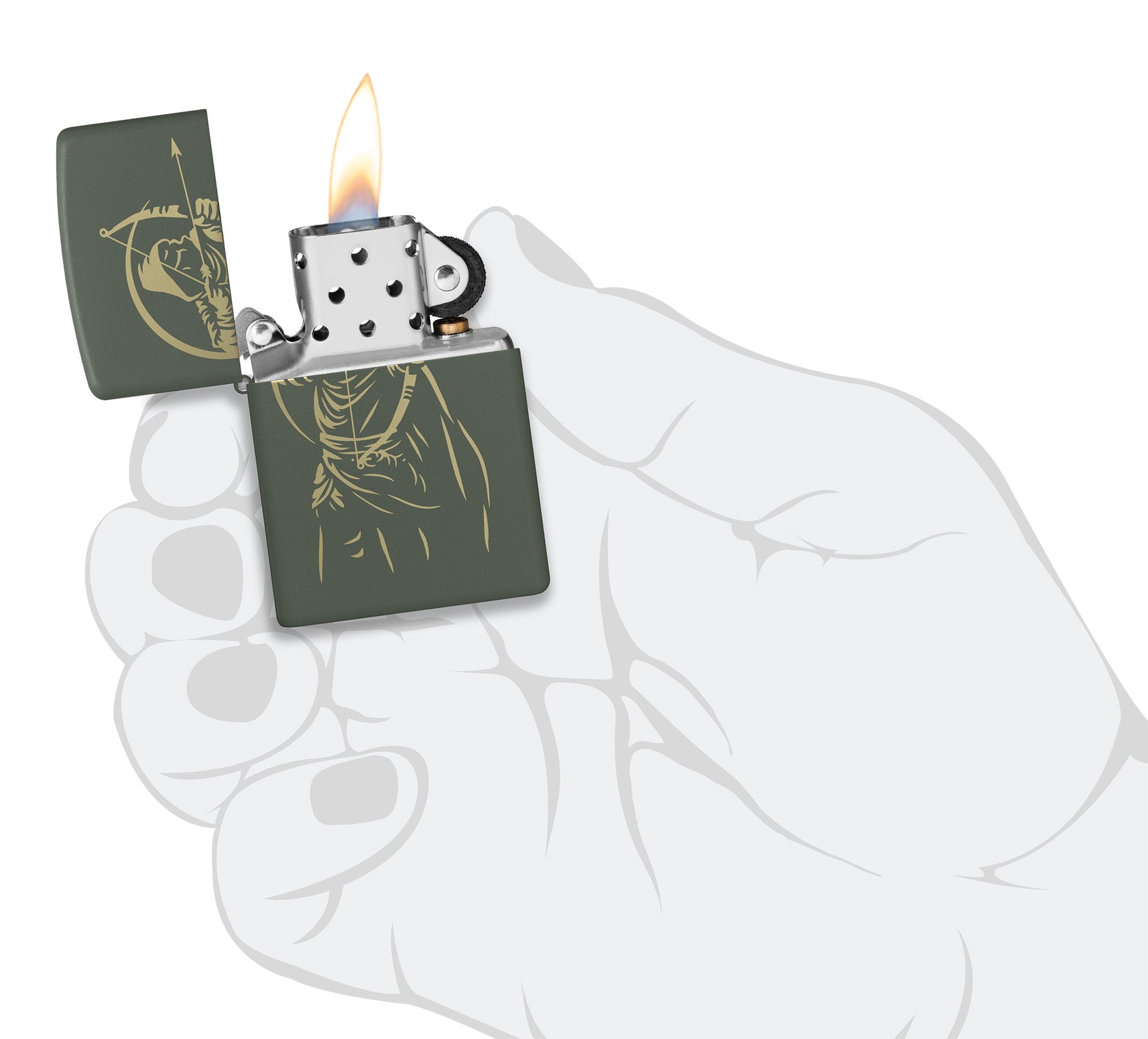 Jetez votre dévolu sur ce briquet Green Matte classique. Un archer en capuche est représenté avec un arc et des flèches dans un motif Laser Engrave net, tandis qu'apparaissent les accents de laiton de l'étui sous l'élégante finition mate.