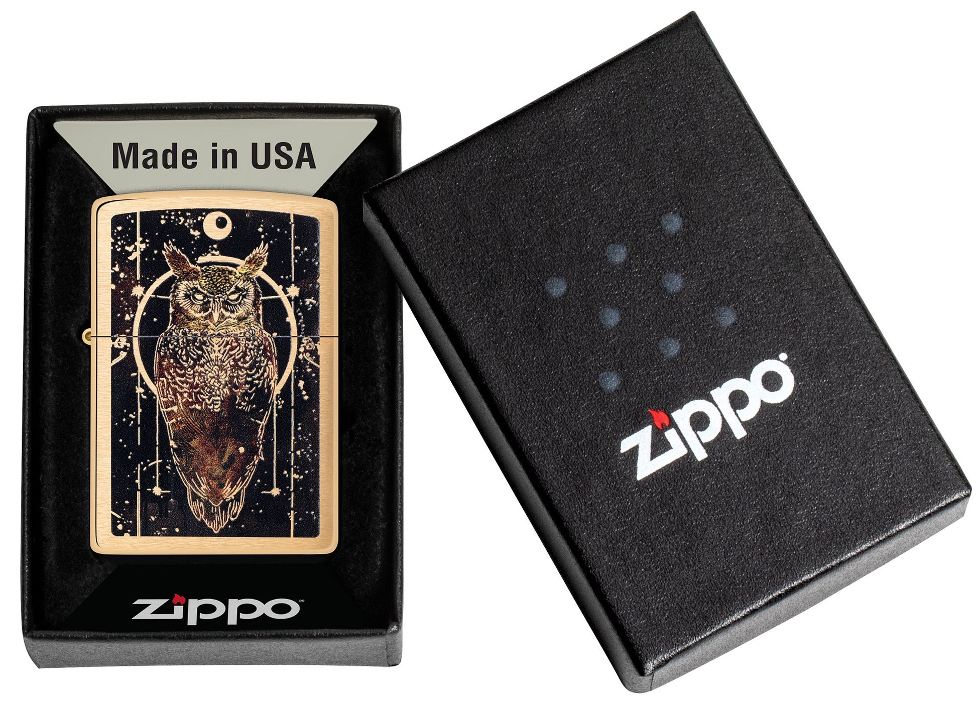 Représentant la sagesse, la prospérité et la chance, un hibou perché orne la surface de ce briquet Brushed Brass classique dans un motif d’image colorée mystique et complexe.