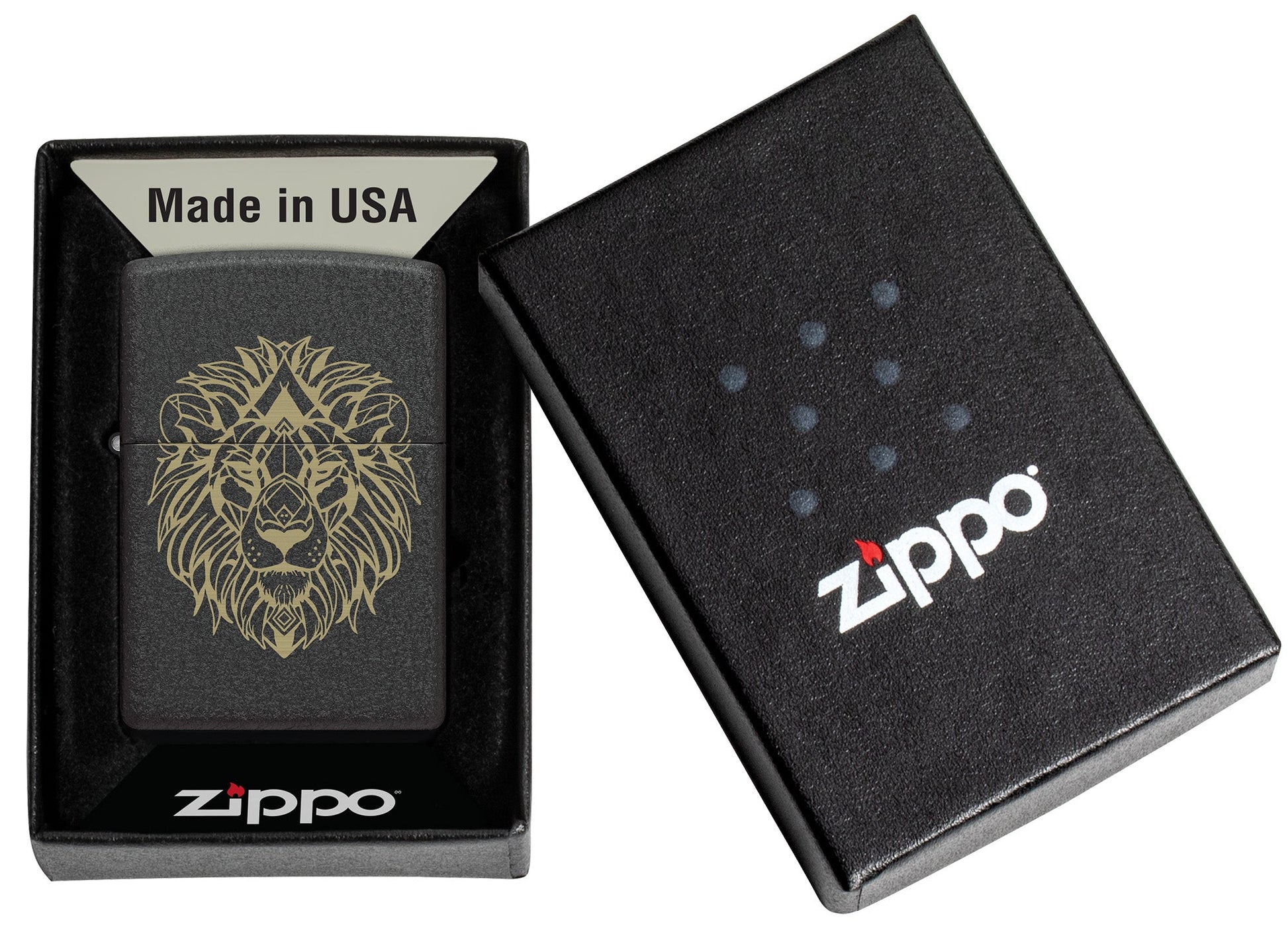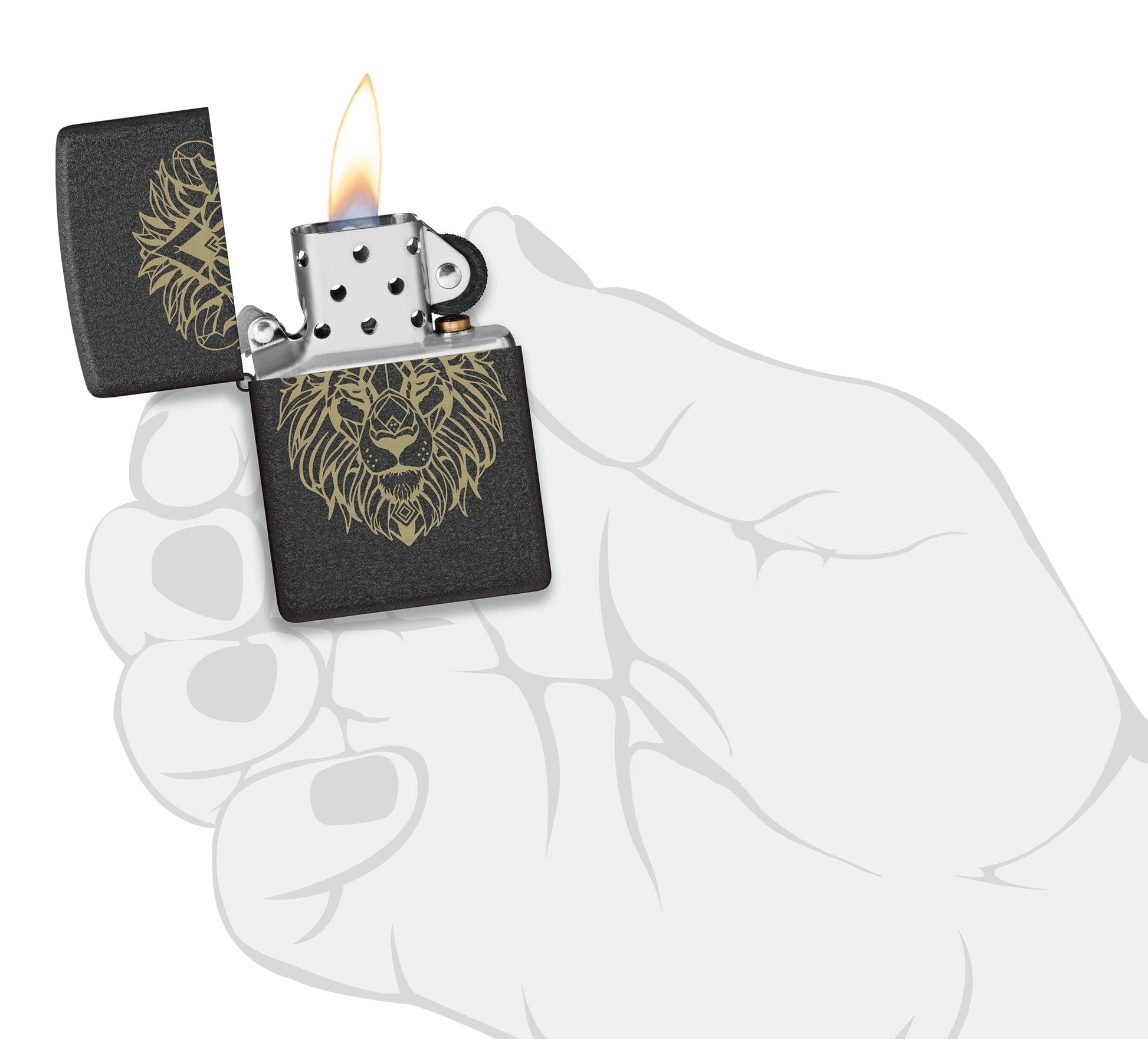 Des lignes et des formes complexes dessinent un lion parfaitement symétrique sur ce briquet Black Crackle® classique dans un motif Laser Engrave épuré.