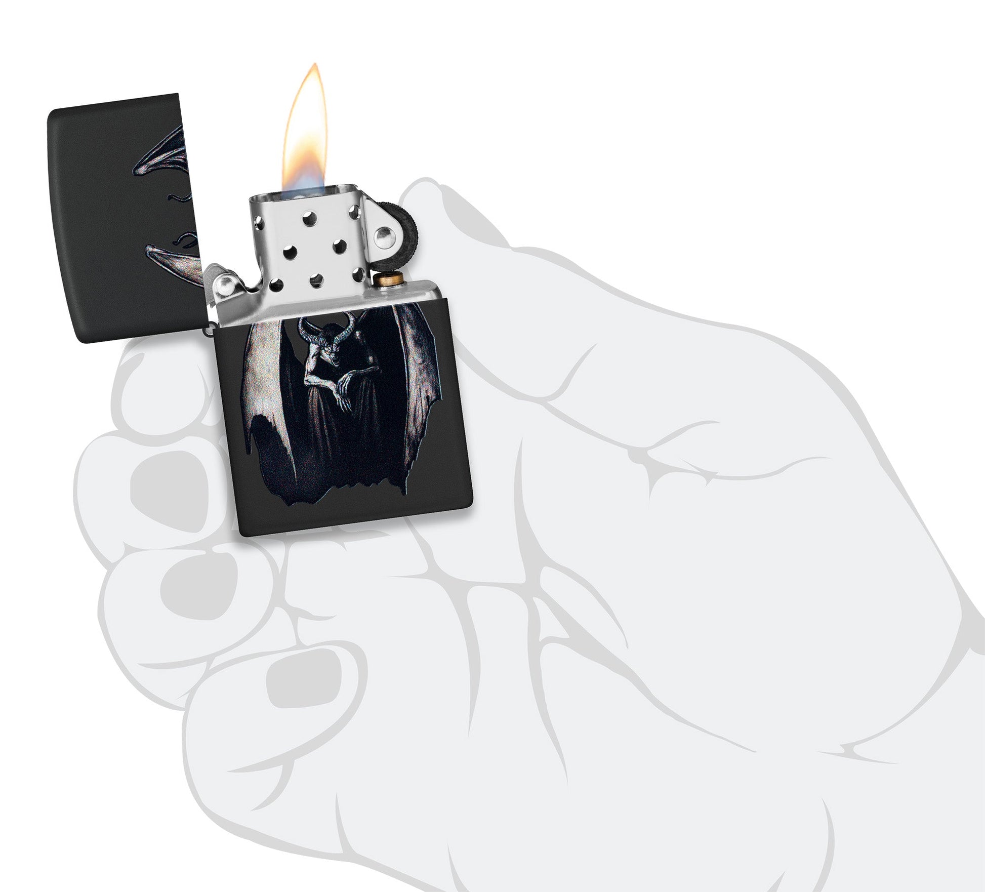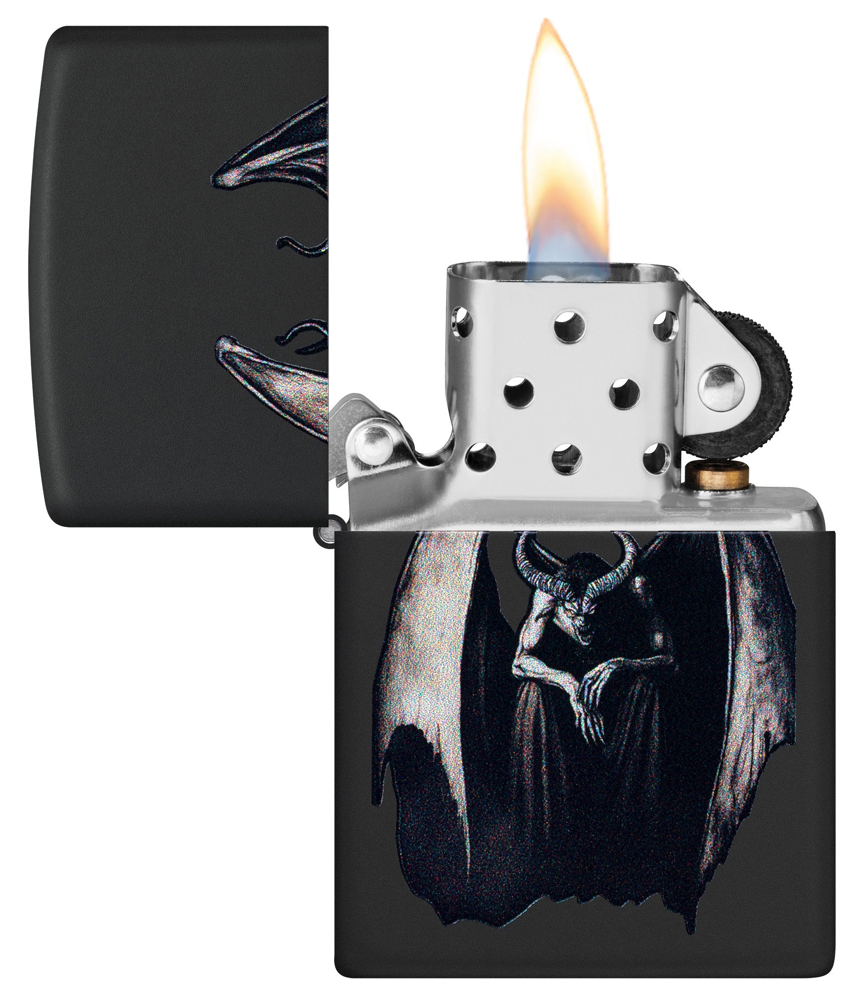 Muni de cornes effrayantes et d'énormes ailes, un monstre d'un autre monde prend la pose sur la surface de ce briquet Black Matte classique au motif d’image colorée sinistre.