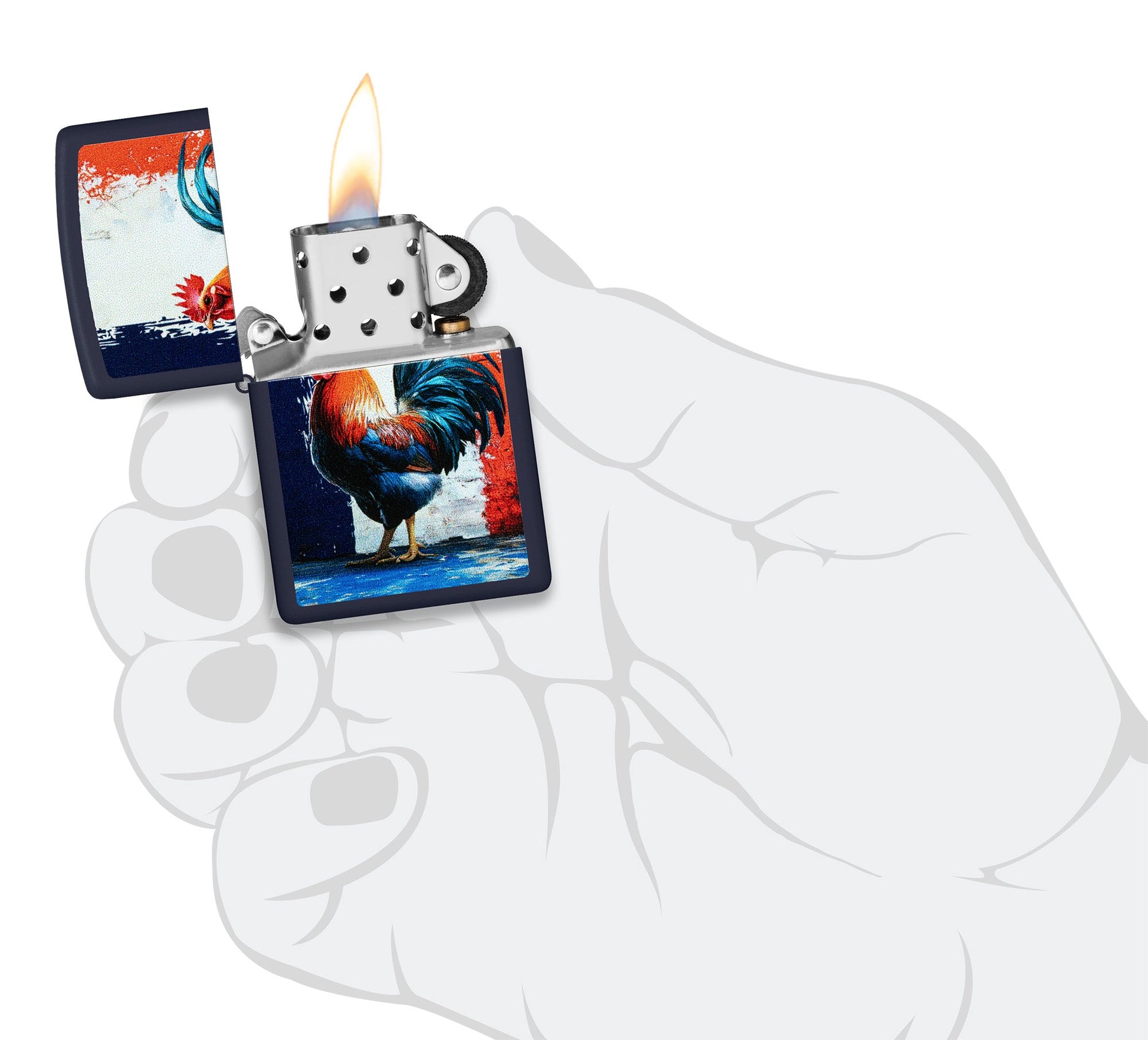 Un coq coloré se pavane fièrement sur ce briquet classique bleu marine mat au motif Image colorée éclatant.