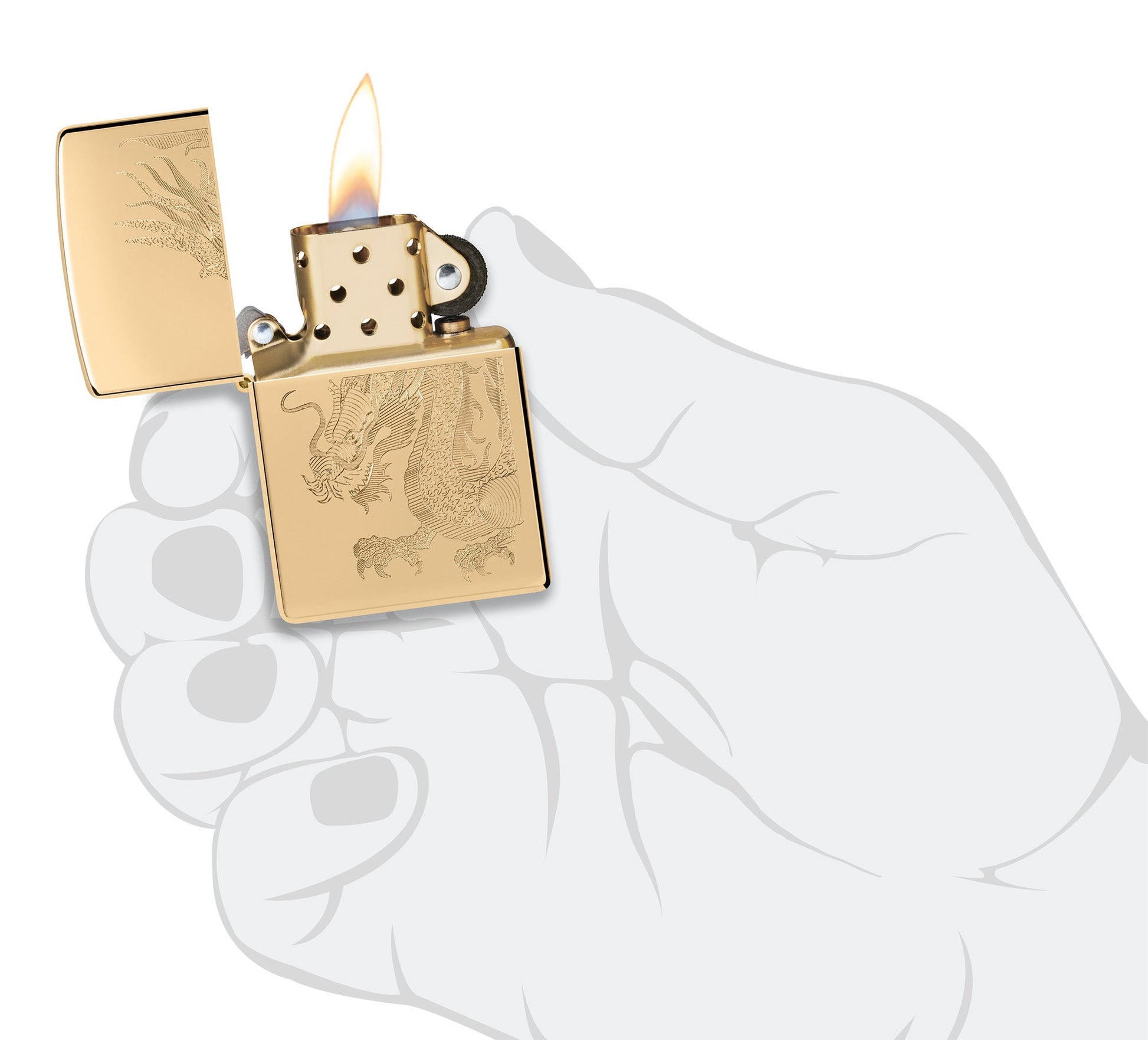 Un motif Gravure auto complexe représentant un dragon féroce, symbolisant le pouvoir, la force et la sagesse, orne ce briquet classique en laiton poli.