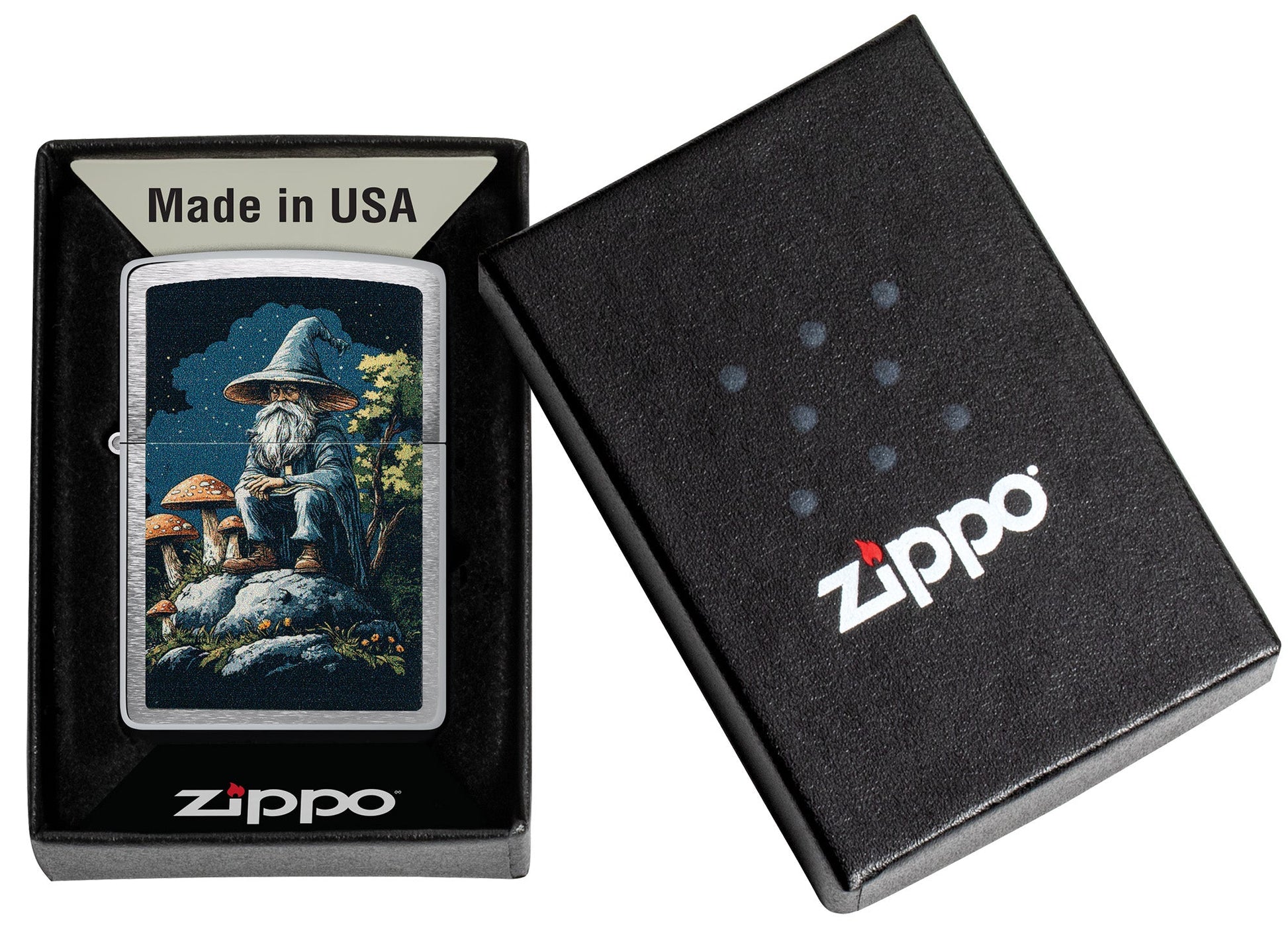 Tout droit sorti d’un livre de contes, un vieux magicien buriné est assis parmi les feuillages et les champignons sur ce briquet classique en chrome brossé au motif Image colorée féérique.