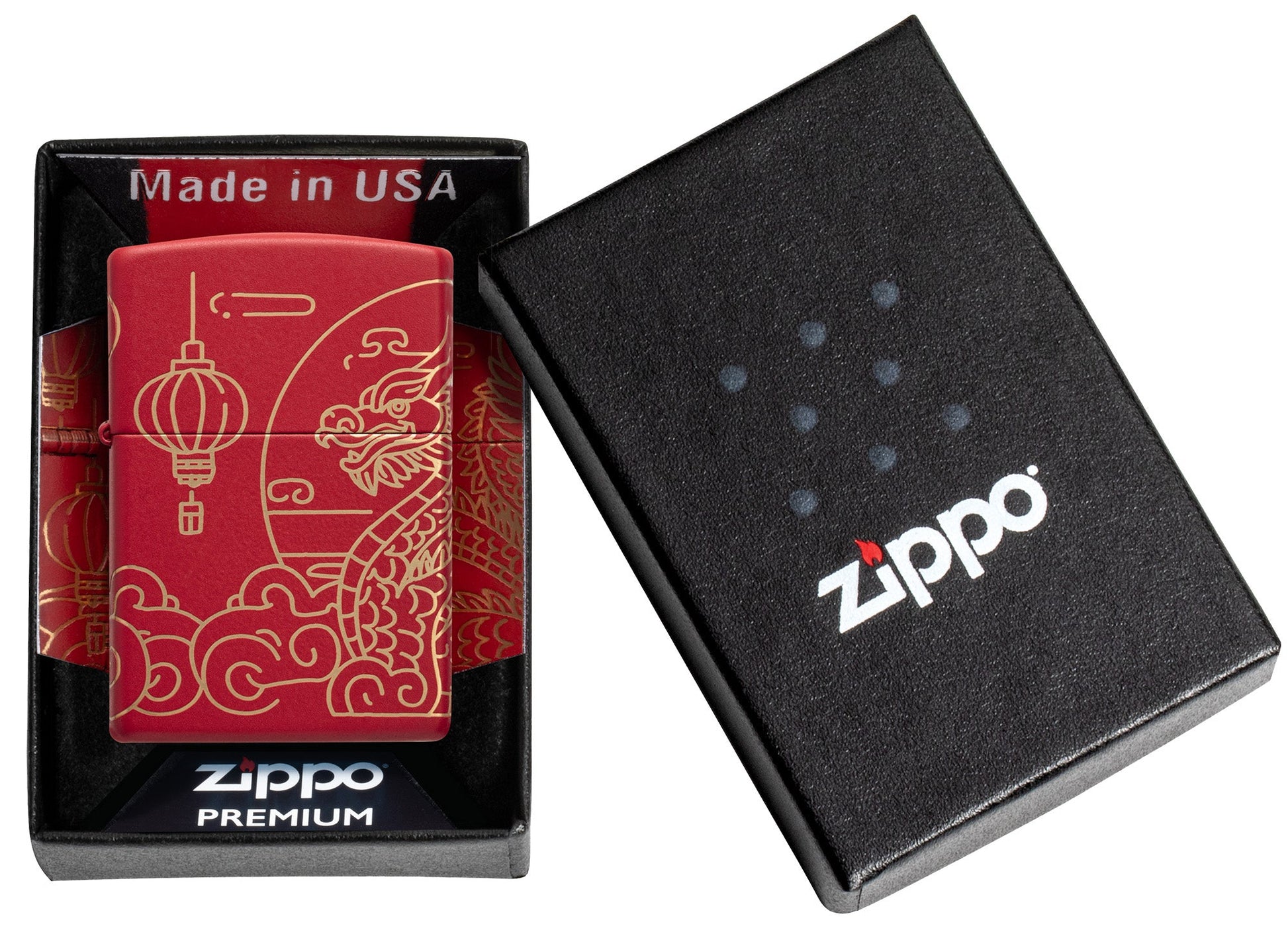 Célébrez l’espoir et la beauté du Nouvel An chinois avec ce briquet classique rouge mat. Un élégant motif Laser à 360°, représentant un magnifique dragon et des lanternes, couvre toute la surface de ce briquet.