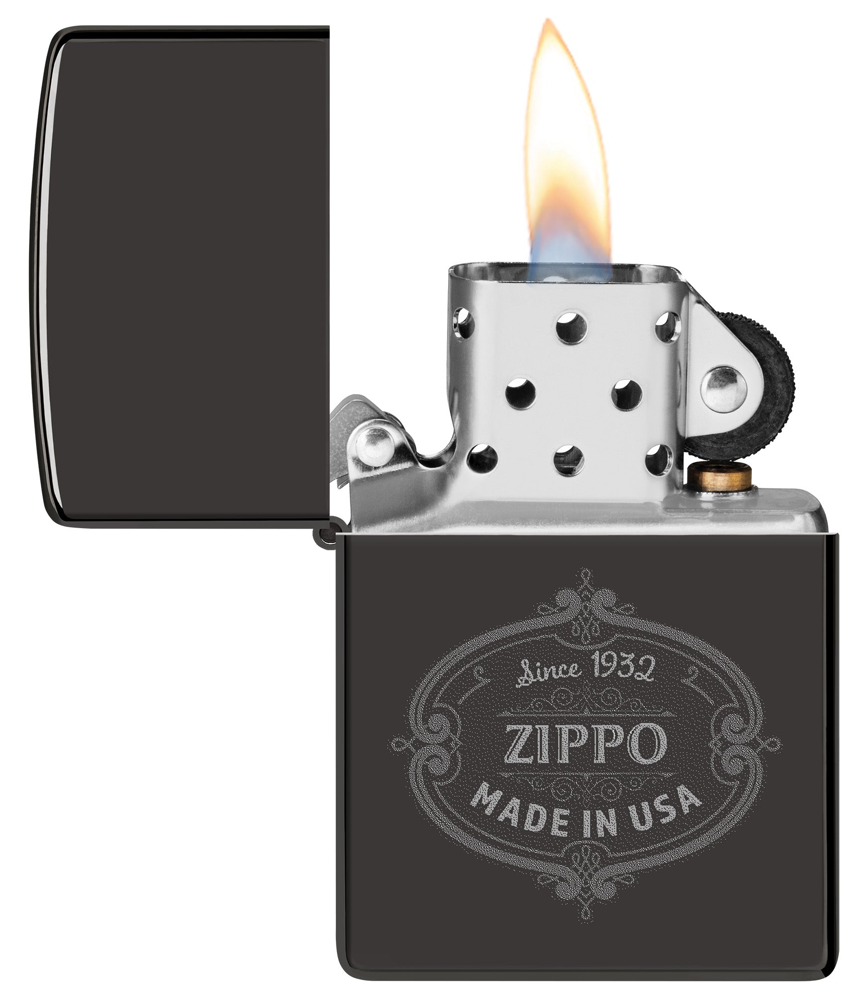 Ce briquet classique noir brillant arbore le logo Zippo et l’année de création de la marque ainsi que l’inscription « Made in USA », dans un motif Image photo élégant.