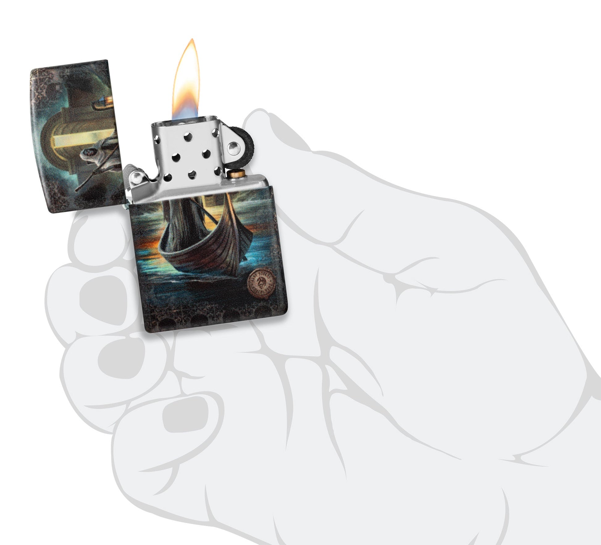 Ce briquet classique 540 Couleur rend hommage à l’œuvre mystique d’Anne Stokes. Inspiré des légendes grecques, « The Ferryman » (Le passeur) représente le personnage qui transporte les âmes des défunts vers le royaume des morts. Il est entouré d’un subtil motif de crânes et, au dos du briquet, un sablier nous rappelle que nous sommes mortels.