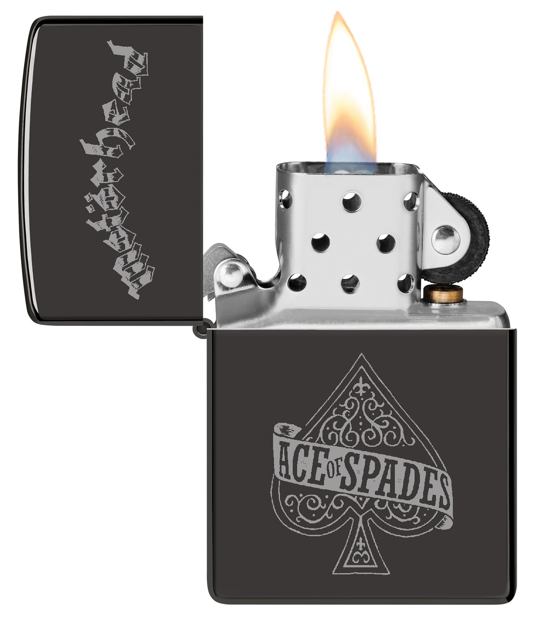 Revivez la musique de Motörhead avec ce briquet classique noir brillant. La pochette de l'album Ace of Spades apparaît sous le logo du groupe dans un design Photo Image fumé.