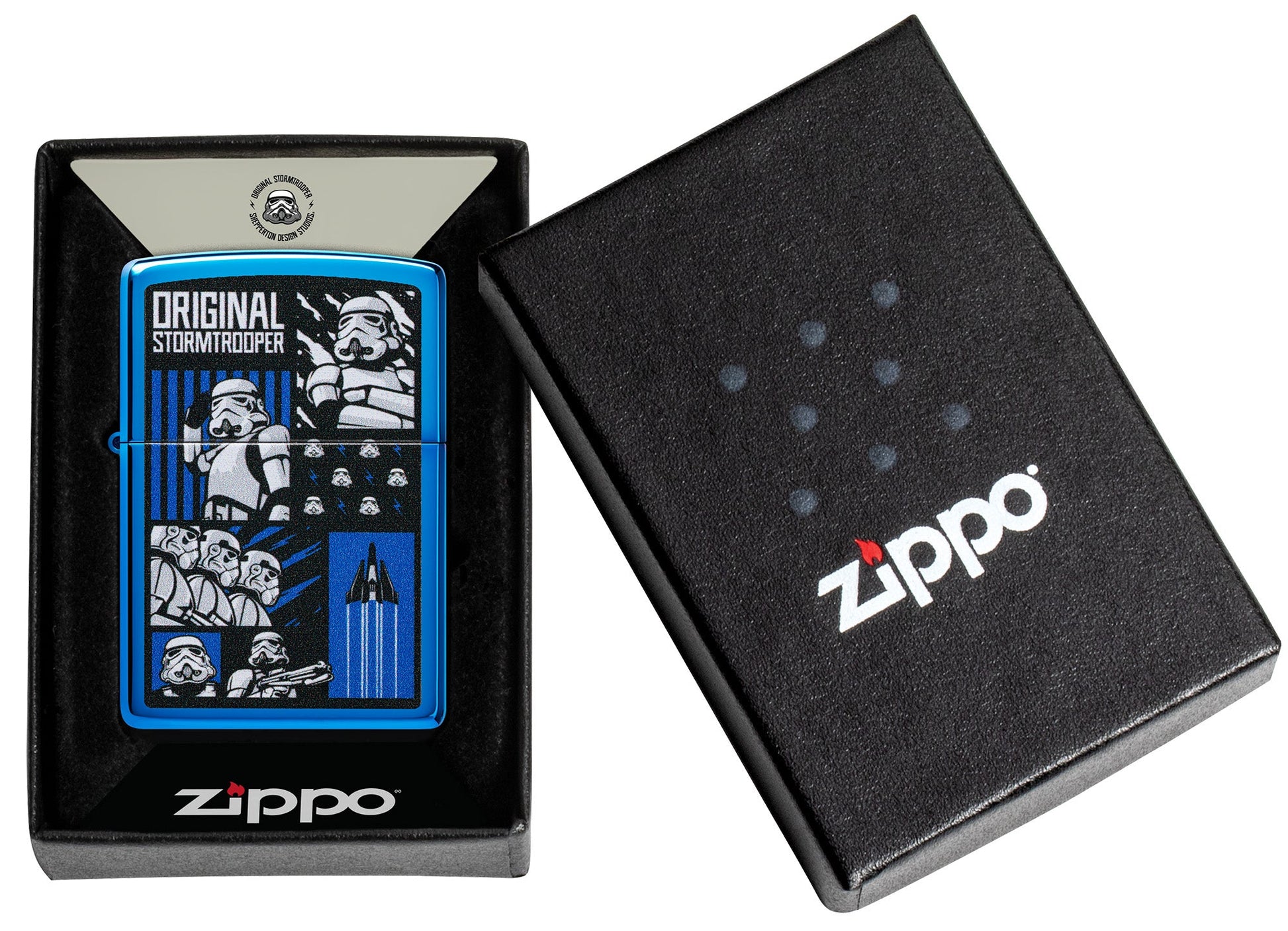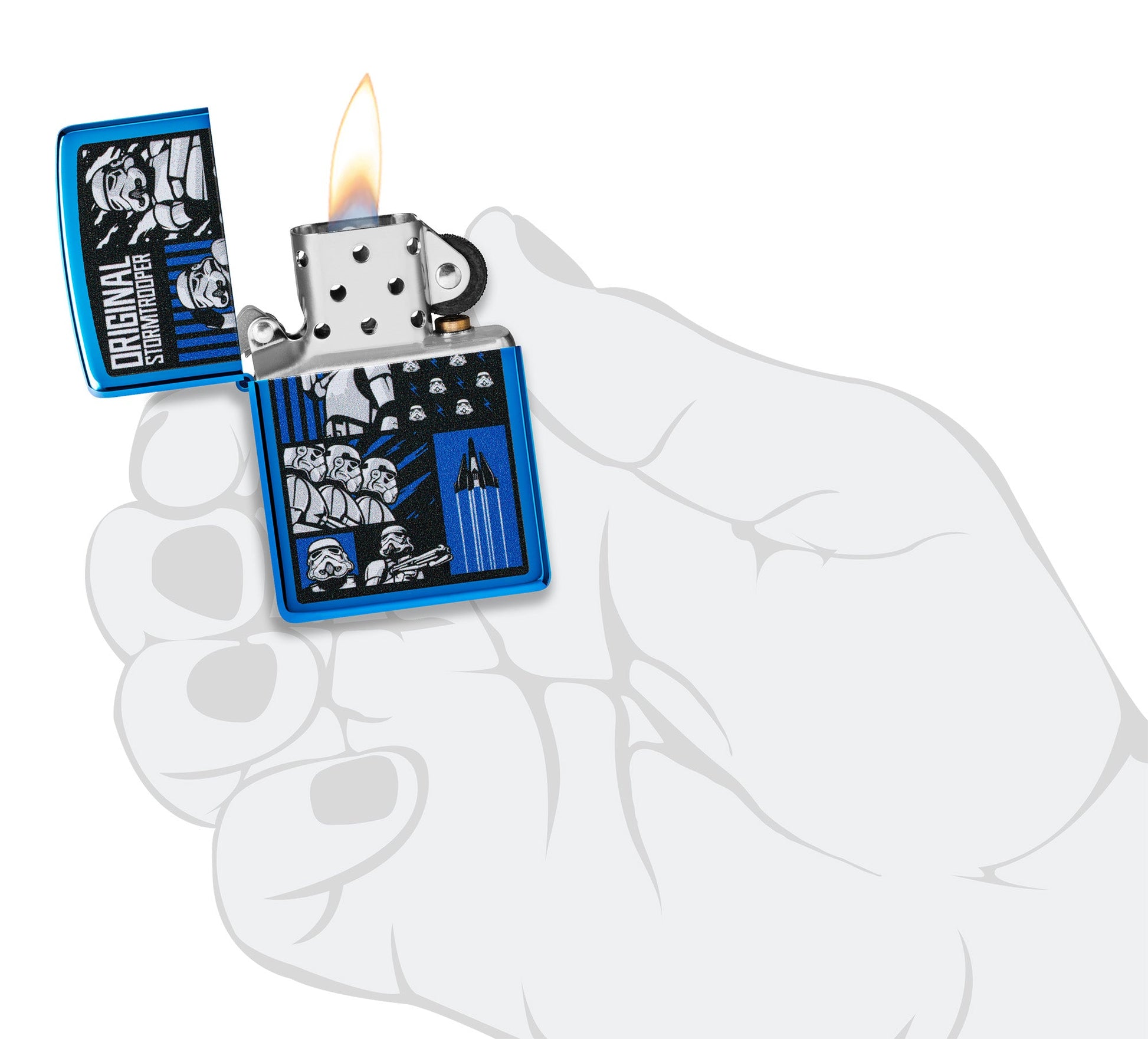 Peut-être la force de combat la plus reconnaissable de la galaxie, ce design d’Original Stormtrooper trouve parfaitement sa place sur ce classique briquet High Polish Blue. Le design Color Image présente un collage des soldats adorés dans une série de scénarios palpitants.