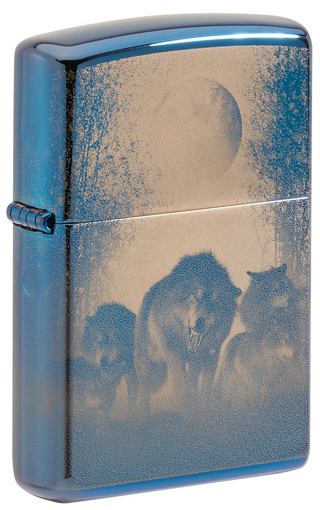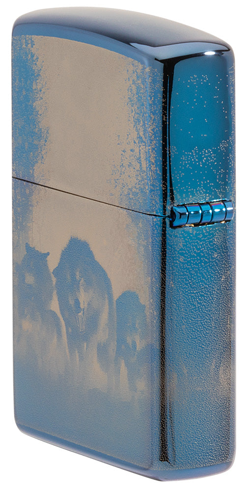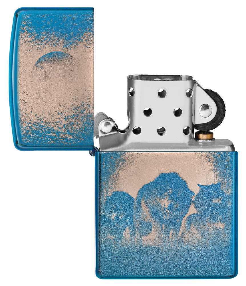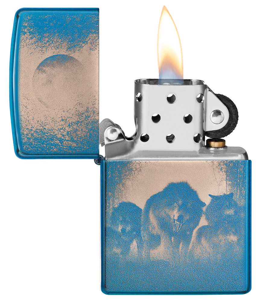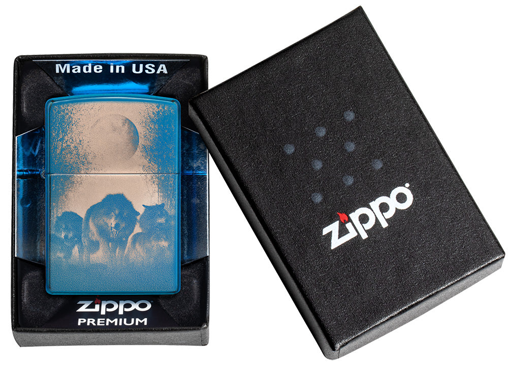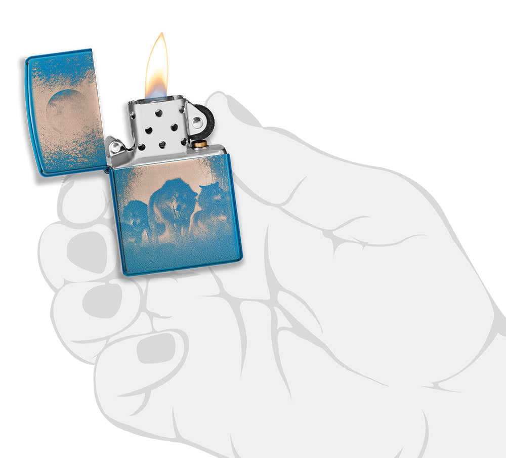La surface bleue polie brillante confère au briquet un aspect noble et attrayant. La photo détaillée de la meute de loups et de la pleine lune crée une atmosphère captivante et capture la beauté sauvage de la nature.